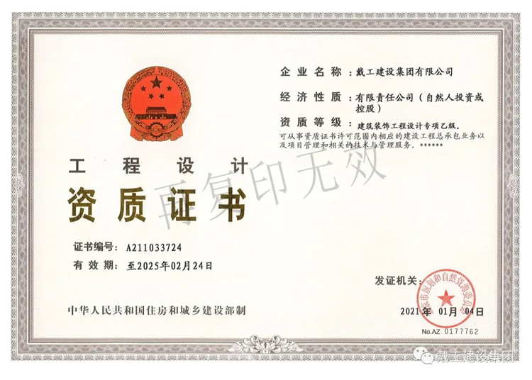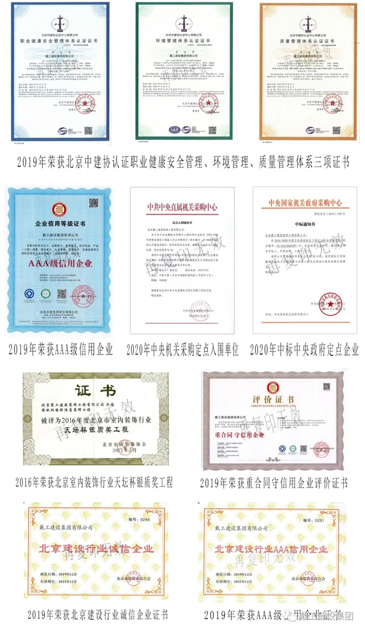 戴工建設(shè)集團(tuán)有限公司系一家集裝飾設(shè)計(jì)、工程施工、材料配送、木門、地板、家具、 裝飾品開(kāi)發(fā)為一體的裝飾企業(yè)。公司位于北京市大興區(qū)。具有建委頒發(fā)的建筑裝飾裝修專業(yè) 壹級(jí)、防水保溫工程專業(yè)壹級(jí)、建筑幕墻專業(yè)貳級(jí)、消防設(shè)施專業(yè)貳級(jí)、電子與智能化專業(yè) 貳級(jí),特種工程(結(jié)構(gòu)補(bǔ)強(qiáng))專業(yè)不分等級(jí)、建筑機(jī)電安裝專業(yè)叁級(jí)、環(huán)保工程專業(yè)叁級(jí)、 鋼結(jié)構(gòu)專業(yè)叁級(jí)、建筑工程總承包叁級(jí)、建筑裝飾工程設(shè)計(jì)專項(xiàng)乙級(jí)、中國(guó)展覽館協(xié)會(huì)展覽 陳列工程設(shè)計(jì)與施工一體化壹級(jí)資質(zhì)和中國(guó)展覽館協(xié)會(huì)展覽工程企業(yè)資質(zhì)。公司通過(guò)了GB/T19001,IS014001,GB/T/OHSAS 認(rèn)證。主要從事辦公空間、餐飲酒店、商業(yè)空間、學(xué)校、 醫(yī)院、別墅、住宅等場(chǎng)所的裝修設(shè)計(jì)和施工。公司經(jīng)北京市工商管理局正式批準(zhǔn)注冊(cè)、北京市建委審核認(rèn)定,已取得國(guó)家正規(guī)資質(zhì), 為中國(guó)建筑裝飾協(xié)會(huì)、中國(guó)室內(nèi)裝飾協(xié)會(huì)、北京室內(nèi)裝飾協(xié)會(huì)、北京市建筑裝飾協(xié)會(huì)的會(huì)員 單位,誠(chéng)信五星級(jí)單位、質(zhì)量 AAA 級(jí)單位。多年來(lái)公司持續(xù)穩(wěn)步發(fā)展,下設(shè)財(cái)務(wù)部、綜合管理部、工程質(zhì)量部、市場(chǎng)開(kāi)發(fā)部、經(jīng)營(yíng) 部、設(shè)計(jì)部和合同預(yù)算部七個(gè)部門。建立了從方案設(shè)計(jì)、工程施工、質(zhì)量監(jiān)督到售后服務(wù)等 一整套細(xì)致合理的服務(wù)流程體系。由經(jīng)驗(yàn)豐富、時(shí)尚創(chuàng)新的設(shè)計(jì)精英;正規(guī)培訓(xùn)、技藝嫻熟 的南方技工;資深專業(yè)的管理人員共同組建成一支誠(chéng)信、敬業(yè)、務(wù)實(shí)、創(chuàng)新的精英團(tuán)隊(duì)。先 進(jìn)的辦公及施工、檢測(cè)設(shè)備;人文、科學(xué)的企業(yè)管理模式,為工程質(zhì)量和公司發(fā)展提供了有 力的保障。公司以先進(jìn)的設(shè)計(jì)理念、精深的設(shè)計(jì)功底為先導(dǎo),以規(guī)范的管理、精湛的施工技術(shù)為基 礎(chǔ),以完善的服務(wù)體系為依托,以產(chǎn)業(yè)化模式經(jīng)營(yíng)降低成本為優(yōu)勢(shì),為客戶提供專業(yè)化、人 性化、個(gè)性化的裝修產(chǎn)品和服務(wù),并不懈努力以提升和超越客戶的消費(fèi)價(jià)值。面對(duì)激烈的市場(chǎng)競(jìng)爭(zhēng),公司全體員工一直秉承“以質(zhì)量求生存,以服務(wù)求發(fā)展”的經(jīng)營(yíng) 理念,“客戶的滿意是我們工作的唯一標(biāo)準(zhǔn)”,始終堅(jiān)持以客戶的需求和滿意為核心,從而使 公司不斷發(fā)展壯大,并贏得了較大的市場(chǎng)份額,成為裝飾行業(yè)中的佼佼者。公司將一如既往的致力于為社會(huì)各界提供更完善、更完美的裝修服務(wù),精心鑄造“戴工” 品牌!并愿與業(yè)界同仁攜手,共建行業(yè)自律,維護(hù)市場(chǎng)環(huán)境,樹立行業(yè)新風(fēng),推動(dòng)行業(yè)發(fā)展, 引領(lǐng)裝修新潮流,構(gòu)建和諧社會(huì)之和諧裝修新篇章!
