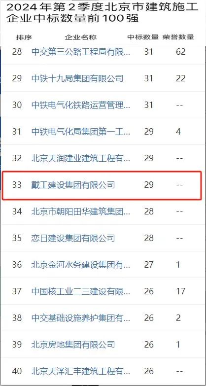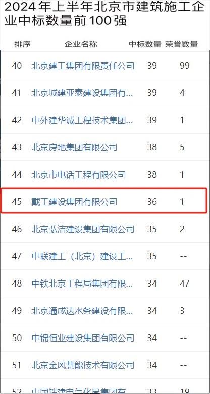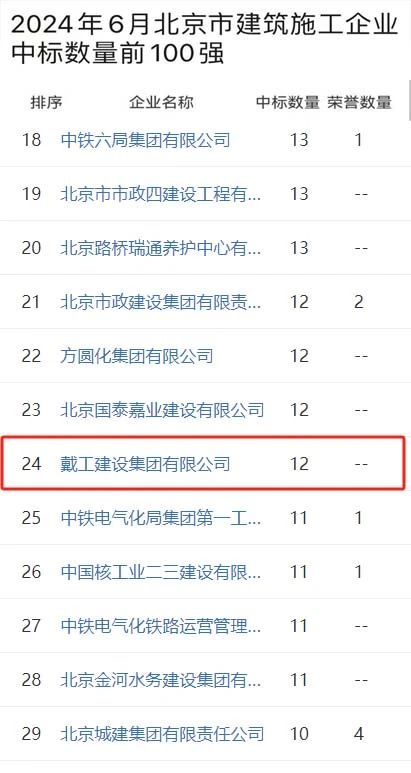 時(shí)間推進(jìn)到2024年6月,戴工集團(tuán)更是迎來了單月的高光時(shí)刻。在這個(gè)關(guān)鍵月份,戴工集團(tuán)憑借出色的項(xiàng)目策劃和執(zhí)行能力,一舉將排名提升至北京市建筑施工企業(yè)中標(biāo)數(shù)量前100強(qiáng)的第24位。這一成績(jī)的取得,充分展示了戴工集團(tuán)在短期內(nèi)的快速響應(yīng)能力和高效執(zhí)行力,也為其在市場(chǎng)上的進(jìn)一步拓展奠定了堅(jiān)實(shí)基礎(chǔ)。