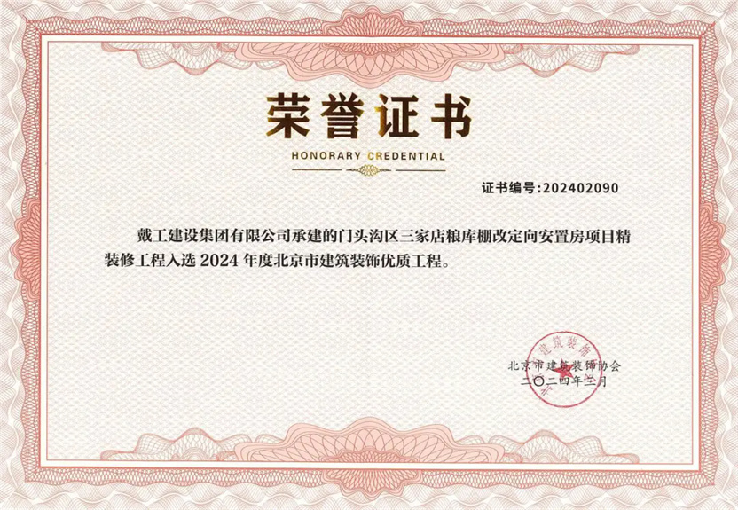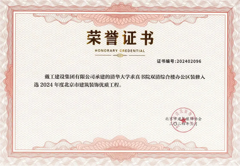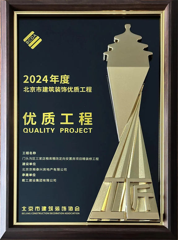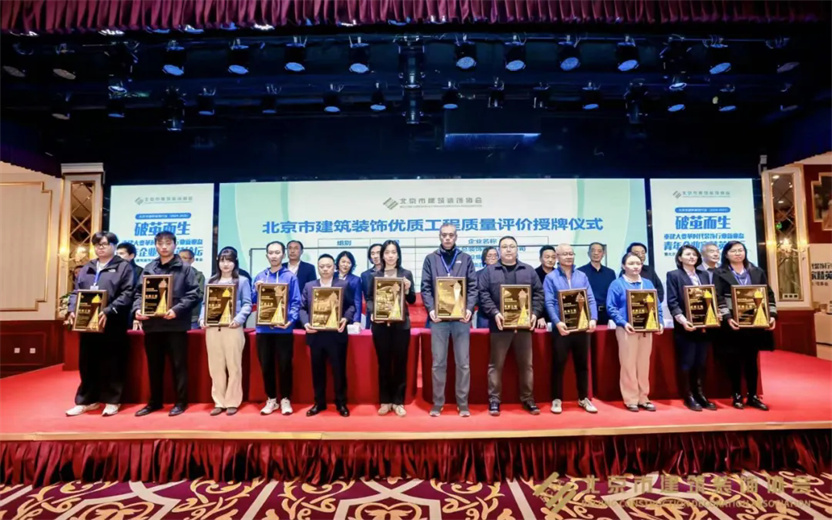 同時,2023-2024年度北京市建筑裝飾優(yōu)質(zhì)工程質(zhì)量評價結(jié)果及施工組織設(shè)計競賽也在會議中公布,戴工集團憑借精湛的施工工藝和嚴格的品質(zhì)把控,所承建的“門頭溝三家店糧庫棚改定向安置房項目精裝工程”以及“清華大學求真書院雙清綜合樓辦公區(qū)裝修項目”均獲得2024年度北京市建筑裝飾優(yōu)秀工程獎!