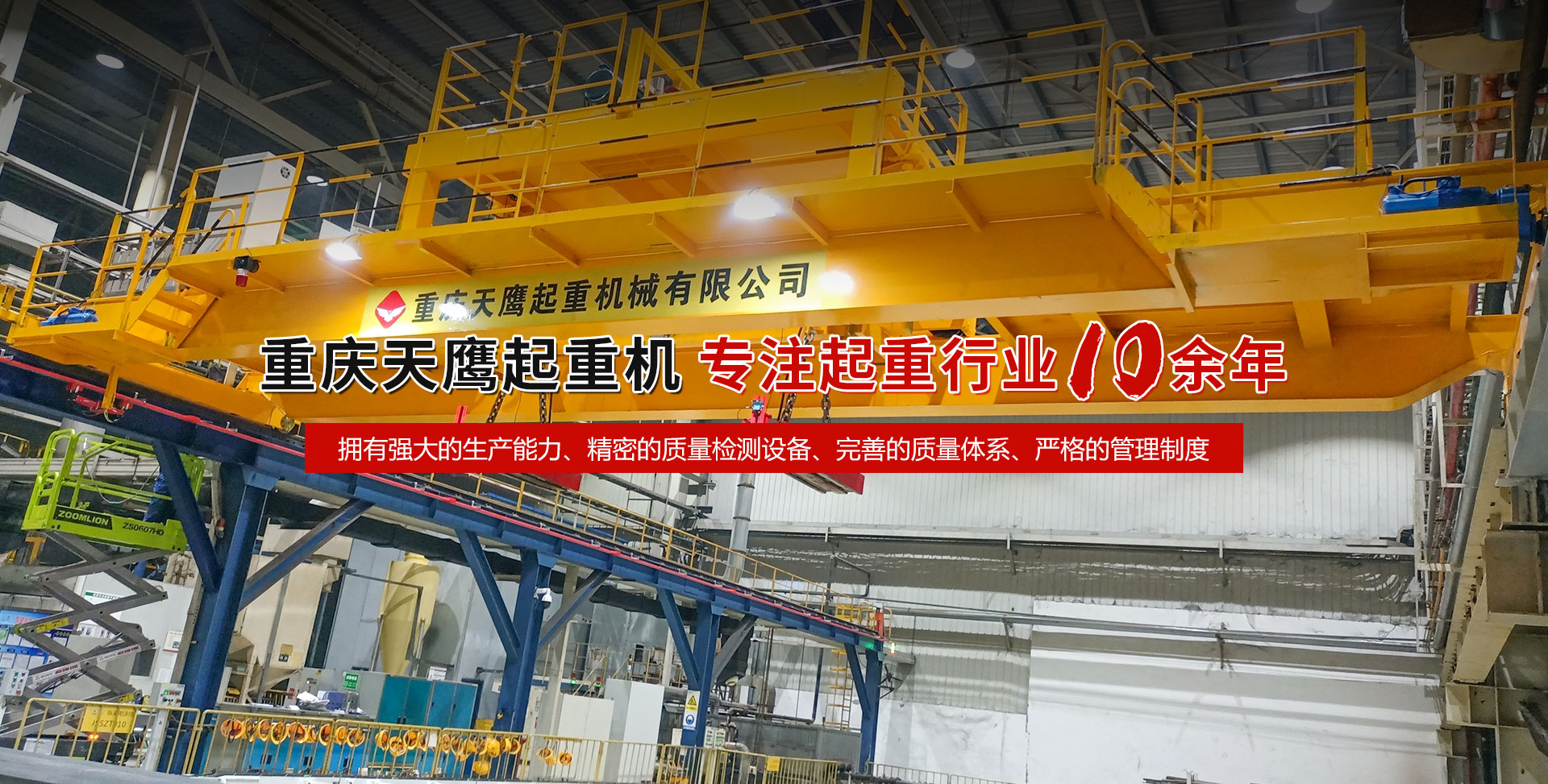 重慶天鷹起重機(jī)械有限公司成立于2014年,主營(yíng)起重機(jī)的銷(xiāo)售、安裝和維護(hù)等相關(guān)服務(wù)。中國(guó)重型機(jī)械工業(yè)協(xié)會(huì)員單位、為中國(guó)工程機(jī)械工業(yè)協(xié)會(huì)工程機(jī)械維修分會(huì)會(huì)員單位及西南地區(qū)起重機(jī)械定點(diǎn)安裝維修單位。具有國(guó)家質(zhì)量監(jiān)督檢疫總局頒發(fā)的特種設(shè)備安裝維修改造質(zhì)格證書(shū)。并率先通過(guò)了IS09001-2000質(zhì)量體系認(rèn)證?! 」咀?cè)資金3000萬(wàn)元;廠(chǎng)房面積2萬(wàn)平方米;各種生產(chǎn)檢測(cè)設(shè)備50臺(tái)套,公司技術(shù)力量雄厚,聘請(qǐng)了國(guó)內(nèi)知名起重機(jī)專(zhuān)家、工程技術(shù)人員擔(dān)當(dāng)項(xiàng)目經(jīng)理、技術(shù)總工程師及顧問(wèn)?,F(xiàn)擁有員工100多人,其中工程技術(shù)人員12人。 主導(dǎo)產(chǎn)品為各類(lèi)橋、門(mén)式起重機(jī)及輕小型起重設(shè)備,具備生產(chǎn)起重量200t及以下通用橋、門(mén)式起重機(jī)的能力,尤其在200t以下起重機(jī)產(chǎn)品上具備較強(qiáng)的市場(chǎng)競(jìng)爭(zhēng)力,為許多行業(yè)設(shè)計(jì)制造了技術(shù)含量高、技術(shù)性強(qiáng)的起重設(shè)備,許多產(chǎn)品在原設(shè)計(jì)標(biāo)準(zhǔn)上進(jìn)行了較大的改進(jìn)、優(yōu)化和創(chuàng)新;其中NH型系列電動(dòng)葫蘆、HD型電動(dòng)單梁處于國(guó)內(nèi)高水平..... 好的產(chǎn)品品質(zhì)需要由較高的裝備水平來(lái)保證,公司購(gòu)買(mǎi)了“大型數(shù)控落地鏜”、“數(shù)控切割機(jī)床”、“自調(diào)式焊接滾輪機(jī)”、“數(shù)顯液壓板料折彎?rùn)C(jī)”、“超大型數(shù)控臥式車(chē)床”、“數(shù)控液壓水平下調(diào)式三輥卷板機(jī)”、“單柱移動(dòng)式立式車(chē)床”“擁有用于單梁生產(chǎn)的全國(guó)一條拋丸噴漆烘干線(xiàn)、葫蘆噴漆烘干線(xiàn)和全國(guó)較大的100T葫蘆試驗(yàn)臺(tái)和檢測(cè)中心”等各種先進(jìn)的加工設(shè)備,新建廠(chǎng)房面積近2萬(wàn)平方米?! ≠|(zhì)量是企業(yè)的生命,天鷹公司依據(jù)“ISO 9001國(guó)際質(zhì)量管理體系”標(biāo)準(zhǔn),制定并完善了公司的質(zhì)量管理體制。堅(jiān)持質(zhì)量體系的內(nèi)審和外審,將質(zhì)量管理工作落實(shí)到企業(yè)生產(chǎn)經(jīng)營(yíng)的全過(guò)程。 您的微笑,是天鷹永恒的追求;天鷹的服務(wù),是您首要的選擇!因?yàn)槲覀儓?jiān)信:“誠(chéng)信是本、質(zhì)量鑄就品牌”。為您服務(wù)是我們的榮耀,勤奮而進(jìn)取的天鷹人,時(shí)刻期盼著您的到來(lái)。